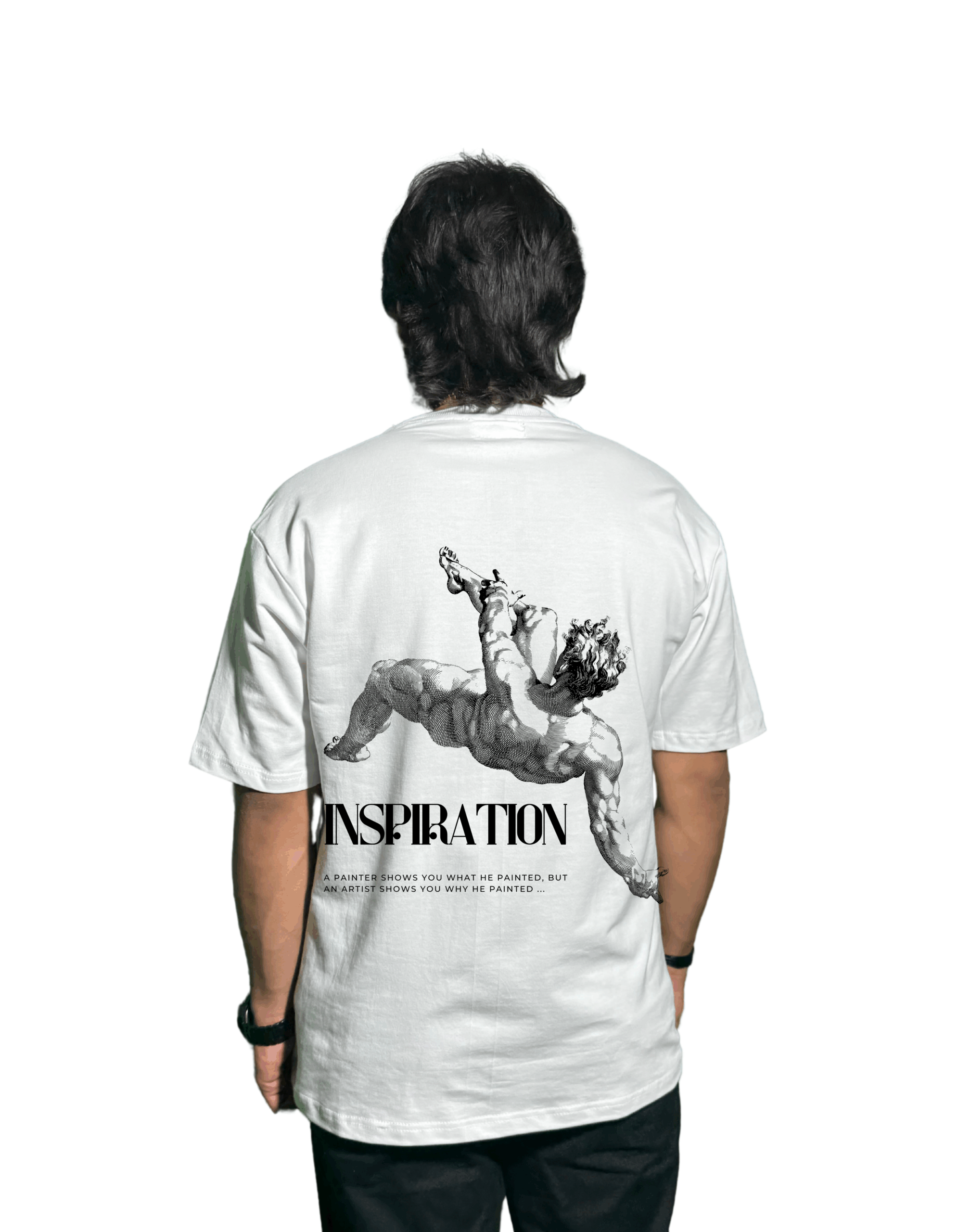 Channel the energy of creation itself with the “Inspiration” Oversized Graphic T-Shirt, a wearable tribute to the spirit of artistry and creative thinking. This premium white tee features minimalist front text – “INSPIRATION” – and transforms on the back with an arresting illustration of a classical figure reaching out, reminiscent of iconic art masterpieces. Beneath, a thought-provoking quote reads: “A painter shows you what he painted, but an artist shows you why he painted.”